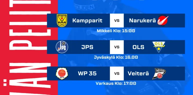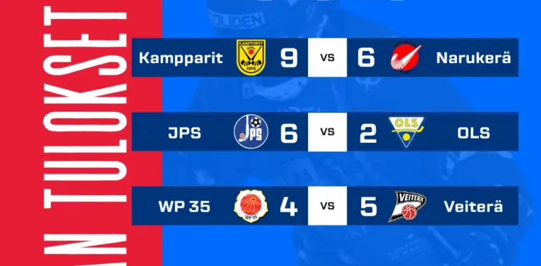 Voitot Kamppareille, JPS:lle, ja Veiterälle Tänään nähtiin kolme vauhdikasta ottelua, kun Kampparit kaatoi Narukerän maalijuhlassa 9–6 ja JPS hoiteli OLS:n selvin numeroin 6–2. Kamppareiden voiton avaimina olivat toisen jakson terävä startti ja kyky vastata jokaiseen Narukerän kiriin nopeasti. JPS puolestaan hallitsi pelitapahtumia laukauksilla ja erikoistilanteilla, ja karkasi ratkaisevasti toisella jaksolla. WP35 piti Veiterää pitkään ahtaalla ja kiri lisäajalla maalin päähän, mutta Veiterä vei 4–5 voiton tehokkaalla viimeistelyllä ja tärkeillä momentum-maaleilla. Kolmessa pelissä korostuivat erityisesti erikoistilanteiden merkitys ja se, kumpi joukkue osui kriittisissä hetkissä. Kampparit voitti maalijuhlassa Narukerän 9–6. Toisella jaksolla nähtiin hurja käännekaruselli Kampparit ja Narukerä tarjosivat yleisölle todellisen bandytrillerin, kun ottelu päättyi Kamppareiden 9–6 voittoon. Maaleja syntyi liukuhihnalta, johtoasema vaihteli ja toisella jaksolla verkko heilui erityisen tiheään. Narukerä aloitti tehokkaasti ja siirtyi 12. minuutilla 0–1-johtoon, kun Lauri Sirén viimeisteli pelitilanteesta. Kampparit tuli kuitenkin nopeasti rinnalle: 28. minuutilla Joonatan Alho tasoitti 1–1:een, ja 34. minuutilla Simo Huotelin vei Kampparit jo 2–1-johtoon. Narukerä kuittasi vielä ennen taukoa, kun Iiro Raukko iski 46. minuutilla 2–2-tasoituksen. Toinen jakso repesi käsiin heti alussa. Huotelin osui uudelleen 47. minuutilla (3–2), ja heti perään Leevi Kukkasniemi iski kahdesti: ensin syötti ja sitten maali 48. minuutilla (4–2). Narukerä nousi vielä peliin mukaan – Jesse Kristian Aaltonen kavensi 59. minuutilla (4–3) ja Rasmus Arponen toi rangaistuslyönnistä tasoihin 64. minuutilla (4–4). Ratkaisun makua saatiin 68. minuutilla, kun Ville Aaltonen vei Narukerän ensimmäistä kertaa pitkään aikaan johtoon kulmasta (4–5). Kampparit ei kuitenkaan horjunut: Severi Noponen tasoitti 70. minuutilla (5–5), Kukkasniemi iski uudelleen kulmasta 73. minuutilla (6–5), ja siitä alkoi Kamppareiden ratkaiseva rynnistys. Kasperi Kumela kasvatti eroa 75. minuutilla (7–5), Rasmus Kettunen osui 77. minuutilla (8–5) ja vielä 89. minuutilla (9–6). Narukerä ehti välissä kaventaa, kun Arponen viimeisteli 79. minuutilla (8–6), mutta aivan lopussa Kampparit piti pintansa. Huh huh – jo pelkkä maalien kirjaaminen on kovaa hommaa – Kampparit ansaitsi voittonsa. Yhteenvetona voi sanoa, että Kamppareilla oli enemmän ratkaisijoita ja parempi viimeistely jaksoissa, joissa peli aaltoili.Huotelin + Kukkasniemi toivat jatkuvan uhkan (maalit + syötöt), ja kun siihen tuli vielä Kumela, Kettunen jne., Kampparit pystyi tekemään maaleja useasta tilanteesta. Narukerän maalit tulivat enemmän yksittäisinä iskuina (ja yksi rankari). JPS hallitsi laukauksia ja käänsi paikat maaleiksi – OLS kaatui 6–2 JPS otti vakuuttavan 6–2 voiton OLS:sta ottelussa, jossa pelin kuva piirtyi selväksi jo avausjaksolla: JPS painoi päälle, loi jatkuvasti laukauksia ja kulmia – ja kun maalihanat aukenivat, ero kasvoi nopeasti liian suureksi kurottavaksi. Avausjakso: JPS painoi Ottelu alkoi JPS:n vahvalla otteella. Ensimmäiset minuutit olivat jatkuvaa painetta: laukauksia tuli 2’, 3’, 5’ ja 7’ minuutilla, ja kulmia JPS sai jo varhain (6’ ja 7’). Palkinto tuli 21. minuutilla, kun Saku Hämäläinen iski kulmasta 1–0. OLS sai omat hetkensä, mutta JPS oli tehokkaampi. 36. minuutilla Saku Hämäläinen osui uudelleen – taas kulmasta – ja tauolle mentiin JPS:n 2–0-johdossa. Toinen jakso: ero kasvaa Toisella jaksolla JPS jatkoi samalla kaavalla: kulmia ja laukauksia tasaisesti, ja johto kasvoi 62. minuutilla, kun Jarno Eronen viimeisteli tilanteesta 3–0. Ratkaiseva isku nähtiin 74. minuutilla, kun Riku Hämäläinen nosti lukemiksi 4–0. OLS kavensi 77. minuutilla Niklas Valtasen osumalla (4–1), mutta JPS vastasi heti: Eeli Böhm (78’) ja Tarmo Ässämäki (78’) iskivät peräkkäin ja repivät taululle 6–1. OLS sai vielä lopussa kavennuksen rangaistuslyönnistä 85. minuutilla, kun Valtanen viimeisteli illan toisen osumansa (6–2). JPS piti loppuhetkillä kontrollin ja vei pisteet selvin numeroin. Veiterä vei voiton 4–5 WP35 laittoi Veiterän pitkään ahtaalle ja loi hurjan määrän laukauksia sekä kulmia, mutta pisteet lähtivät silti Veiterälle lukemin 4–5. Ottelun tarina oli selvä: WP35 hallitsi jaksoja, mutta Veiterä oli kliinisempi maalipaikoissaan ja osui juuri oikeissa kohdissa. Nopea alku: jäähy, rankari ja tasoitus Ottelu lähti liikkeelle räjähtävästi. WP35:n Jimi Siiteri joutui 10 minuutin jäähylle jo 3. minuutilla, ja Veiterä käytti tilaisuuden: Ere Verhelä upotti rangaistuslyönnin ja vei vieraat 0–1-johtoon. WP35 kuittasi kuitenkin vielä avausjakson puolella: Kristian Paukkonen tasoitti 15. minuutilla ja Esu Rytkönen vei WP35:n 2–1-johtoon 25. minuutilla. Veiterä tuli rinnalle 32. minuutilla, kun Paavo Simpura osui – tauolle lähdettiin 2–2:sta. Toinen jakso: Veiterä käänsi väkisin Heti jakson alkuun Veiterä iski kahdesti: 46. minuutilla Janne Hauska vei Veiterän 2–3-johtoon. WP35 vastasi nopeasti, kun Juho Holopainen tasoitti 48. minuutilla 3–3:een. Ratkaiseva käänne tuli kuitenkin Veiterän tehokkuudesta: Paavo Huuhtanen vei vieraat 3–4-johtoon 55. minuutilla ja Simpura osui uudelleen 73. minuutilla (3–5). WP35 ei luovuttanut, vaan jatkoi painetta ja kavensi lopussa 90+2’ kulmasta, kun Robert Ruippo iski tilanteeksi 4–5. Loppukiri jäi kuitenkin vajaaksi. Ottelun hahmot