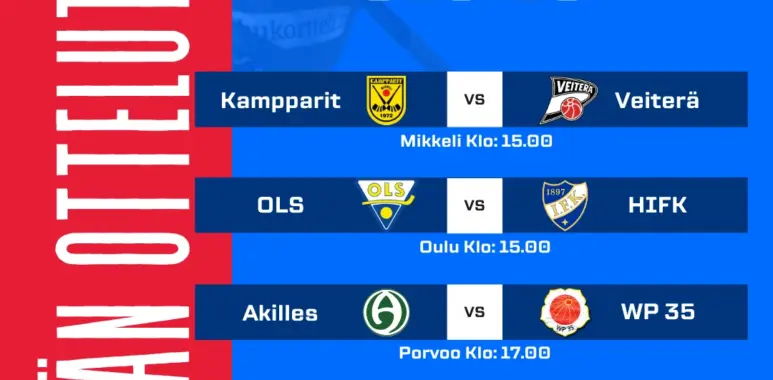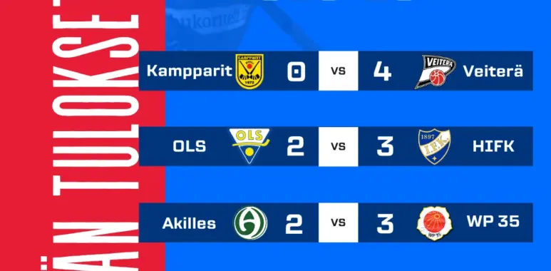Ainoastaan Botnia voitti kotiottelunsa Kierros tarjosi ison nipun tunteita, kun mukana oli sekä selkeitä tuloksia että ihan viime minuuttien trilleri. Veiterä kävi hakemassa Kamppareista tylyn 0–4-voiton, ja kampparilaisten puolustus kyllä kesti monessa hetkessä, mutta hyökkäyspää jäi ilman osumia. Oulussa HIFK venyi raskaasta kuormasta huolimatta 2–3-vierasvoittoon, vaikka OLS nousi toisella jaksolla tasoihin ja laittoi vieraat tiukille. Akilles johti tauolla 2–0, mutta WP 35 käänsi pelin sitkeydellä ja erikoistilanneosumisilla edukseen numeroin 2–3. Kierroksen viihdyttävin näytelmä nähtiin Botnian ja Narukerän välillä, kun Botnia karkasi 4–0:aan ja voitti lopulta niukasti 5–4 Narukerän hurjasta kiristä huolimatta. Erikoistilanteet olivat kierroksella isossa roolissa, ja useampi matsi ratkesi kulmien sekä pilkkujen tehokkuuteen. Samalla nähtiin, että johtoasema ei vielä takaa mitään, jos toisella jaksolla rytmi ja jalka alkavat painaa. Alempana käydään ottelut lävitse yksi kerrallaan ja nostetaan esiin käännekohdat sekä maalintekijät. Otteluraportti: Kampparit – Veiterä 0–4 (0–1) Lauantain kamppailussa Kampparien puolustuspeli piti pitkään pintansa, mutta Veiterä käytti omat hetkensä tehokkaasti ja karkasi lopulta selkeään 0–4-voittoon. Kampparit sai ajoittain pidettyä pelin tiiviinä omassa päässä, mutta maalipaikat jäivät vähiin – etenkin toisella jaksolla. Maalit Ottelun kulku lyhyesti Kampparit-kommentit Veiterää vastaan Kampparien puolustuspeli toimi, mutta hyökkäys sen sijaan ei tuonut osumia. Varsinkin toisella jaksolla tekopaikat olivat vähissä. Tulos lauantaina oli selkeä ja kampparivalmennus myönsi sen. – Vastustaja oli kova. On myönnettävä, että parempi voitti tänään, tuumi ottelun jälkeen Alpo Kaartinen. Otteluraportti: OLS – HIFK 2–3 (1–2) HIFK nappasi Oulusta tärkeän 2–3-vierasvoiton, vaikka OLS tuli toisella jaksolla väkisin rinnalle ja otteluun saatiin kunnon draaman kaari. HIFK johti kahdella maalilla, OLS kampesi tasoihin, mutta lopulta HIFK:n kulmaosuma 71. minuutilla jäi ratkaisevaksi. Maalit Ottelun alku Avausjakso oli pitkälti HIFK:n hallintaa. Helsinkiläiset rakensivat painetta useilla kulmilla ja laukauksilla, ja palkinto tuli ajassa 23’, kun Sokolov viimeisteli avausmaalin Hauskan syötöstä. Kun Auvinen lisäsi johdon 0–2:een 29. minuutilla, HIFK näytti jo karkaavan. OLS sai kuitenkin kiinni ottelusta vielä ennen taukoa, kun Ukkonen pommitti kulmasta kavennuksen 34’ ja toi isännät takaisin peliin. Toinen jakso kääntyi OLS:n kannalta paremmaksi: paine kasvoi, erikoistilanteita tuli ja lopulta Moisala iski 61’ tasoituksen. Hetken näytti siltä, että momentum on täysin oululaisilla – mutta HIFK löysi vielä yhden iskun. Ajassa 71’ Laitinen upotti kulmasta voittomaalin, ja loppu pelattiin HIFK:n johtaessa tilanteenhallinnan kautta. HIFK:n kommentit ottelun jälkeen – Kyllähän se jalka painaa jokaisella, ihan varmasti. Toinen peli putkeen, huonosti nukutun yön jälkeen, totta kai se näkyy. Hyvä, että saimme voiton, Iiro Väkiparta toteaa. Väkiparralle ottelu oli kauden ensimmäinen pitkän toipumisjakson jälkeen. Paluu punapaitaan oli miehelle odotettu hetki – “kuin kuuta nousevaa” – ja kentälle pääsy toi selvästi iloa, vaikka terävin vire on vielä työn alla. – Tuntuu ihan hyvältä. Ei se nyt ihan samanlaista ollut kuin mitä oma paras taso voisi olla, mutta tuosta on hyvä lähteä kehittämään kauden mittaan, Väkiparta sanoo. Yhteenveto Otteluraportti: Akilles – WP 35 2–3 (2–0) Akilles oli pitkään kiinni täydellisessä kotivoitossa: vahva avausjakso toi 2–0-johdon, ja peli näytti kontrolloidulta vielä tauolle mentäessä. Toisella jaksolla asetelma kuitenkin kääntyi, kun WP 35 löysi tehokkuutta erikoistilanteisiin ja nousi lopulta 2–3-voittoon viimeisen kympin aikana. Maalit Ottelun alku Akilles tuli peliin terävästi ja rakensi painetta jo alusta lähtien. Palkinto tuli 11. minuutilla, kun Ässämäki laukoi kulmasta kotijoukkueen johtoon. Akilles jatkoi aktiivista peliä, ja 33. minuutilla Larsson viimeisteli tilanteeksi 2–0. WP 35 haki avausta ajoittaisilla laukauksilla ja käytti myös aikalisän 31. minuutilla, mutta tauolle mentiin Akilleksen selvässä johdossa. Toinen jakso oli kuitenkin WP 35:n nousunäytös. Vieraat lisäsivät painetta – laukauksia ja kulmia tuli tasaiseen tahtiin – ja 56. minuutilla Tuomainen kavensi Nissisen syötöstä. Peli muuttui entistäkin avoimemmaksi: Akilles sai edelleen omia kulmiaan ja laukauksiaan, mutta WP 35 oli nälkäisempi kriittisissä hetkissä. Tasoitus syntyi 74. minuutilla, kun Niiranen osui kulmasta ja toi vieraat rinnalle. Akilles otti aikalisän 81’ hakiakseen uudelleen otetta, mutta ratkaisu tuli silti WP 35:lle: 85. minuutilla Nissinen iski voittomaalin Paukkosen syötöstä ja vei pisteet mukanaan. Ratkaisun avaimet Otteluraportti: Botnia – Narukerä 5–4 (0–0) Ottelu Botnian ja Narukerän välillä tarjosi todellisen draaman kaaren. Avausjakso oli maaliton ja tarkkaa pelaamista, mutta toinen jakso räjähti käyntiin heti aloitusvihellyksestä. Botnia karkasi parhaimmillaan 4–0-johtoon, ennen kuin Narukerä aloitti hurjan loppukirin ja nousi vielä maalin päähän. Botnia piti kuitenkin pintansa ja vei pisteet 5–4. Maalit Ottelun kulku Ensimmäinen jakso oli tapahtumista huolimatta maaliton. Botnia sai useita kulmia ja laukoi aktiivisesti, mutta Narukerä kesti ja pääsi myös kokeilemaan omia paikkojaan. Maaliverkot eivät silti heiluneet ennen taukoa. Toinen jakso käynnistyi Botnian kannalta täydellisesti. Heti jakson alussa Pesonen laukoi kulmasta 1–0 (46’), ja siitä alkoi kotijoukkueen vahvin vaihe. Rouhiainen lisäsi johdon 2–0:aan (52’), ja kun Lappi (65’) sekä Parkkonen (67’) osuivat peräkkäin, taululla komeili jo 4–0. Ottelu näytti ratkenneelta. Narukerä ei kuitenkaan luovuttanut. 