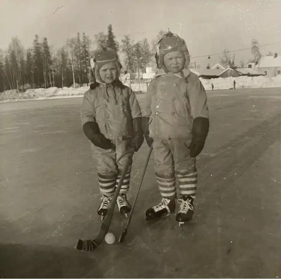 Esko yhdessä veljensä Timon kanssa Veitsiluodon tehtaan kentällä vuonna 1962