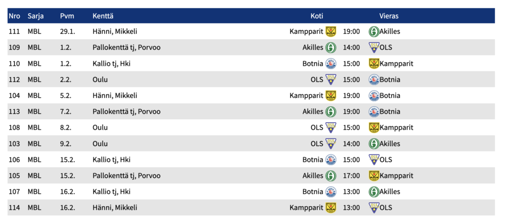 | 3 | Kampparit | 0 | 0 | 0 | 0 | 0 | 1 |