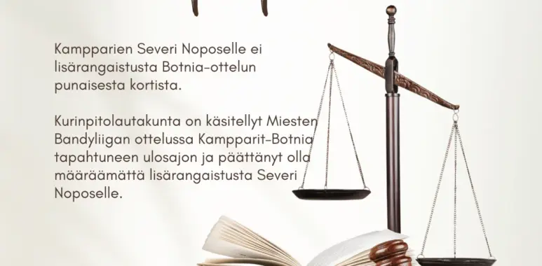 Suomen Jääpalloliitto ry:n kurinpitolautakunta on käsitellyt Miesten Bandyliigan ottelussa Kampparit–Botnia (ottelunumero 121) tapahtuneen ulosajon ja päättänyt olla määräämättä lisärangaistusta Kampparien pelaajalle Severi Noposelle.