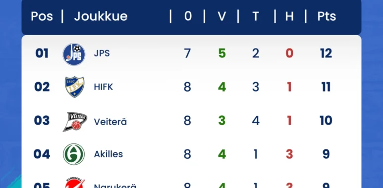 Tämänhetkinen sarjatilanne näyttää jännittävältä, kun kauden puoliväli on käsillä. JPS on noussut sarjan kärkeen vahvalla 12 pisteen saaliillaan, voittaen 7 ottelustaan 5 ja pelaten 2 tasuria. Maali-ero 43-11 kertoo joukkueen vahvasta puolustuksesta ja tehokkuudesta hyökkäyksessä. JPS onkin selkeästi ollut kauden paras joukkue toistaiseksi, no tätä ennustettiin jo kesällä.